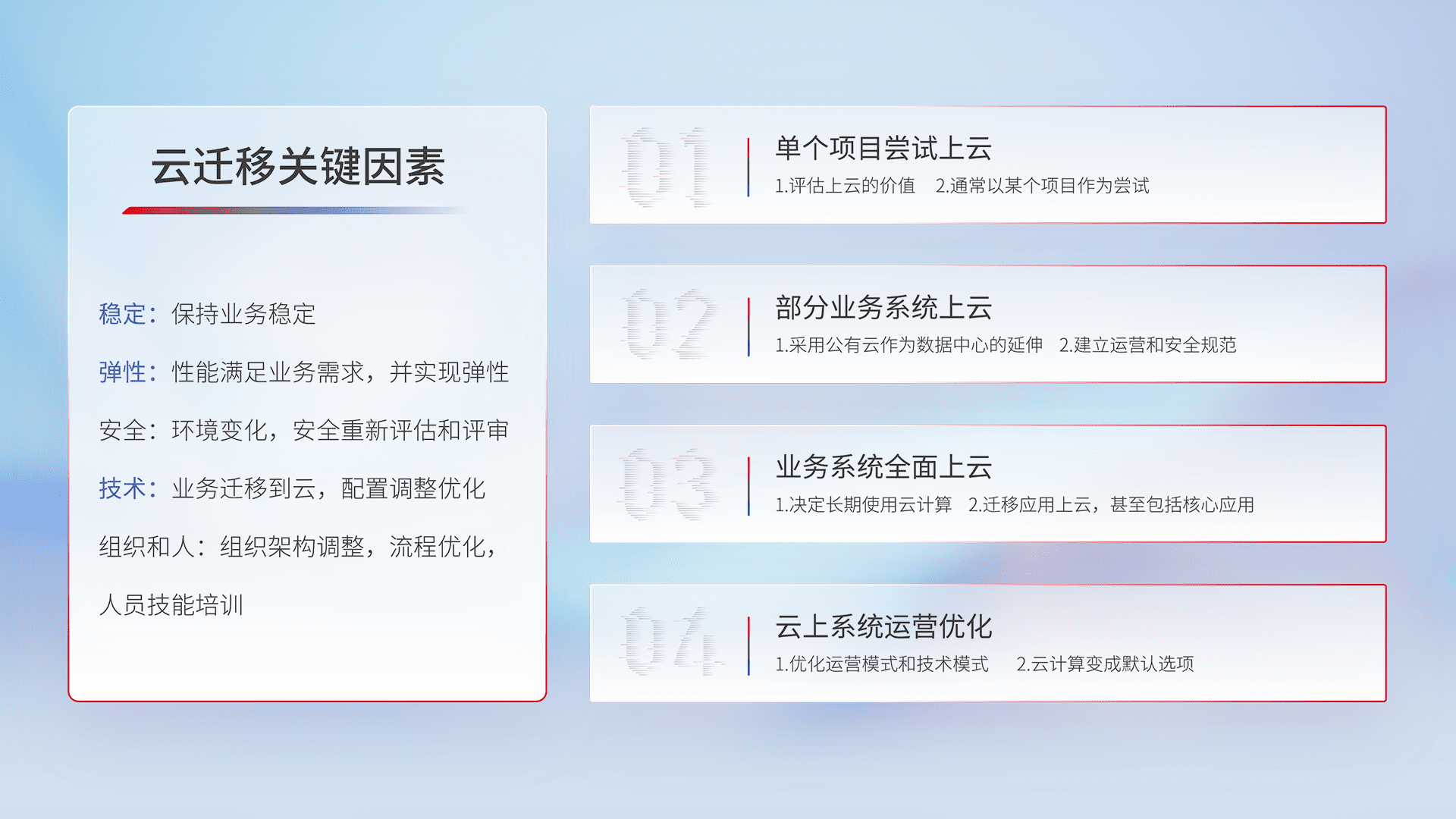 结合实际业务,,从规划设计、、、云平台选型、、、云原生改造、、、、数据迁移、、、、集成交付,,,迁移全过程为客户识别最佳上云路径,,,,做好风险识别管理,,,设计网络架构、、、身份权限、、安全审计合规、、操作审计、、日志审计、、监控告警策略、、、、多站点容灾设计等,,,对云上基础设施进行整体规划,,,提升IT治理水平,,以满足弹性、、高可用、、、高性能的需求。。。
