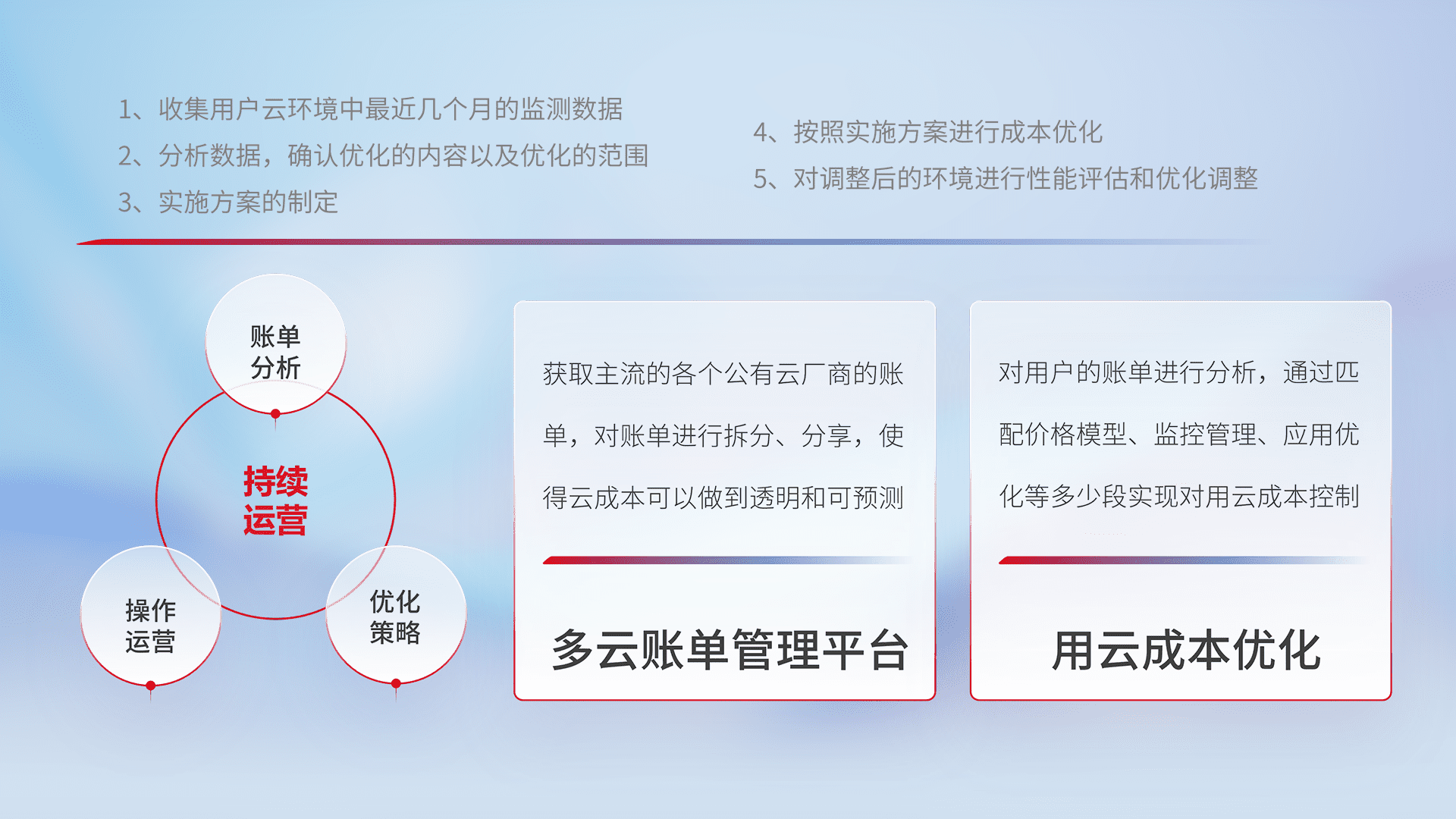 通过多云纳管,,,,以统一的资源数据模型把客户的云资源进行抽象和封装,,进而实现对多云资源的统一操作,,保障云资源管理的可靠性、、、稳定性与可用性。。。量身定制化运维内容,,,,配置、、、、开发运维、、补丁管理、、备份、、、监控、、认证和访问管理、、、、审计和日常巡检等,,,,保障在用云过程中的可靠度,,稳定度以及高可用率。。。